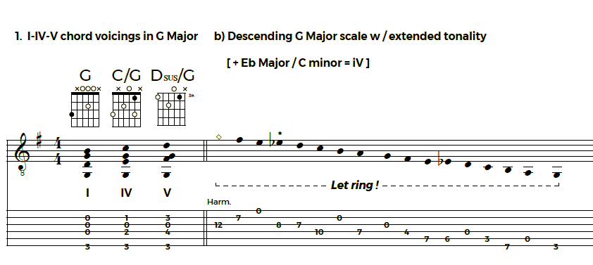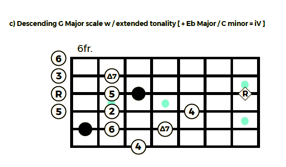 Playing the scale with unconventional fingerings (including open strings and harmonics), as in the sample above, shows how stable the sonic imprint of the scale and its translation to the fretboard really is. The added Eb, borrowed from the Eb Major scale is another way to create a iV minor function to further extend the sound palette. It is also the root for the bVI secondary dominant in G Major which leads chromatically to the V chord.