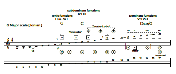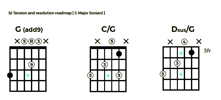You can blur the lines between functions by adding notes from one function to the chord voicing of another function. E.g. adding an A (9), curtesy of the dominant function [ D ] to the tonic chord [ G ] results in a more open sounding Gadd9 voicing. The same applies for the dominant function in this example: the G bass note, borrowed from the tonic function, creates a Dsus voicing including the chord’s 3rd – a nice ‘unsettled’ sound.