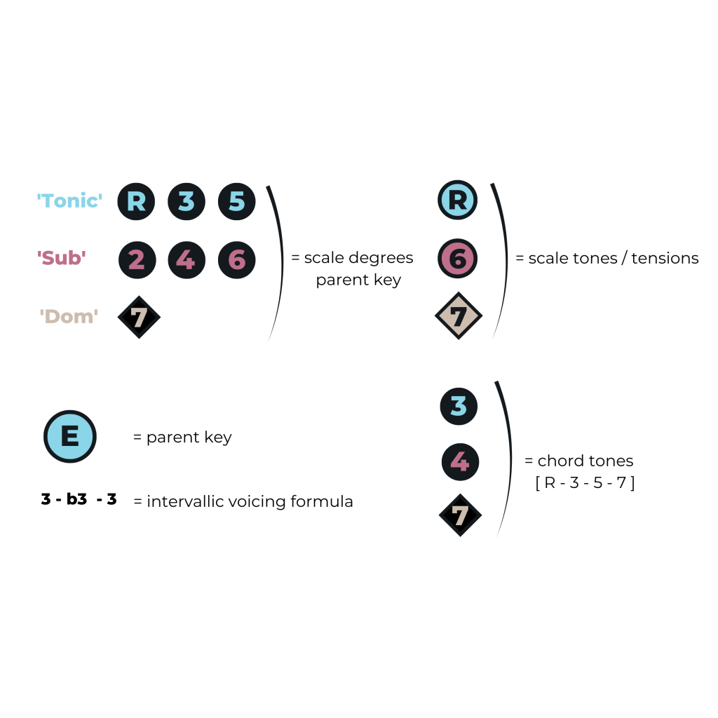 A quick overview of how to use those chord diagrams to your benefit: these are intended for the ‘learning mode’, mapping out how tonal music theory translates to the fretboard as opposed to already having established suggested concepts, mentally and physically, via muscle memory.