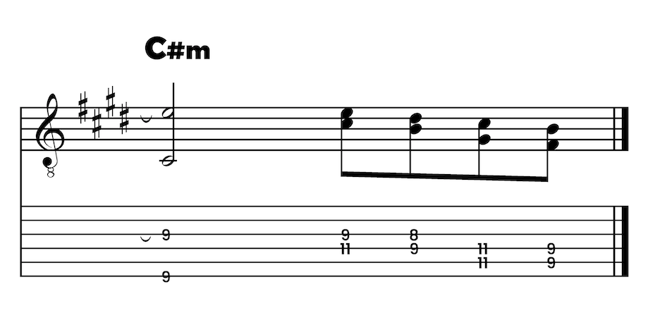 Consequentially, the voicings for IV and I functions continue this principle; they are basically double stops with embellishments (again with the add 9), as opposed to more complete ‘chord grips’.