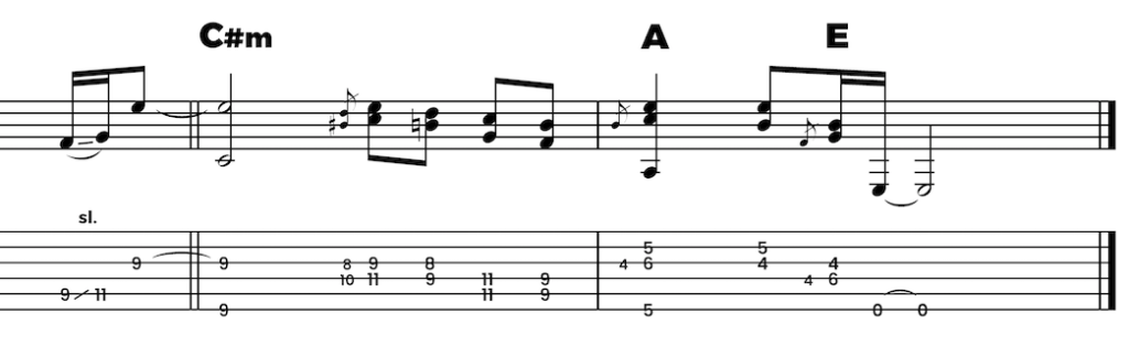The verse of the song is a nice example of how to connect diatonic harmonies [ Vi – IV – I ] with simple yet expressive lines and voicings. While the melody establishes a minor pentatonic sound, the descending double stops over C# minor sport an added 9 ‘color note’ [ D# ]. In the key of E, this note hints at a dominant function [ 3rd of B7 ].