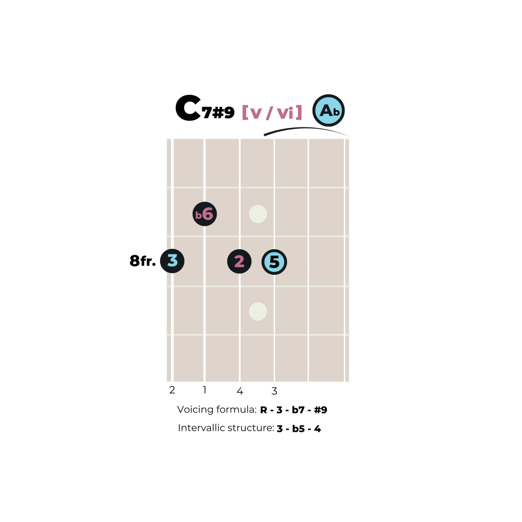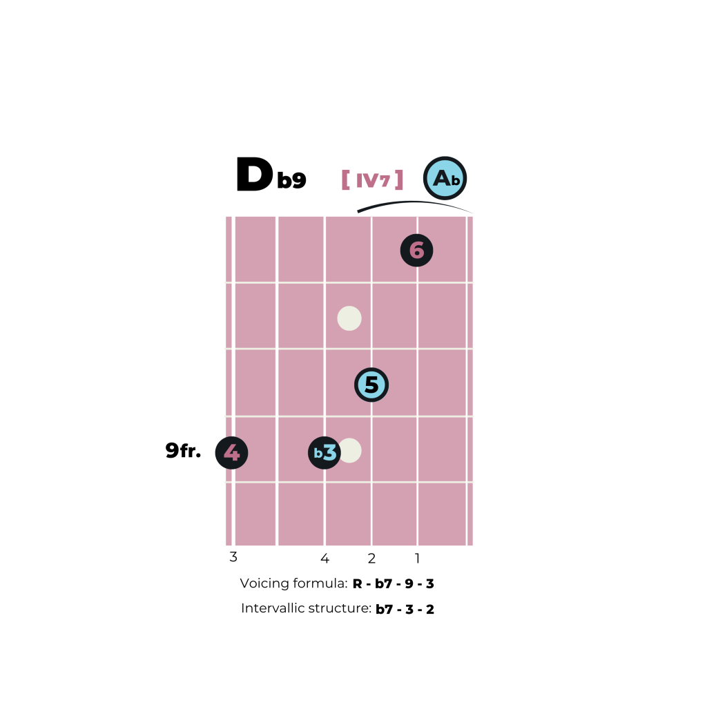Almost – it’s a subdominant function Db9 with a b7 [IV7] instead of the diatonic Db∆. Again, only one note is changed, the diatonic C [3] is lowered to Cb [b3], borrowed from the key of Ab minor.