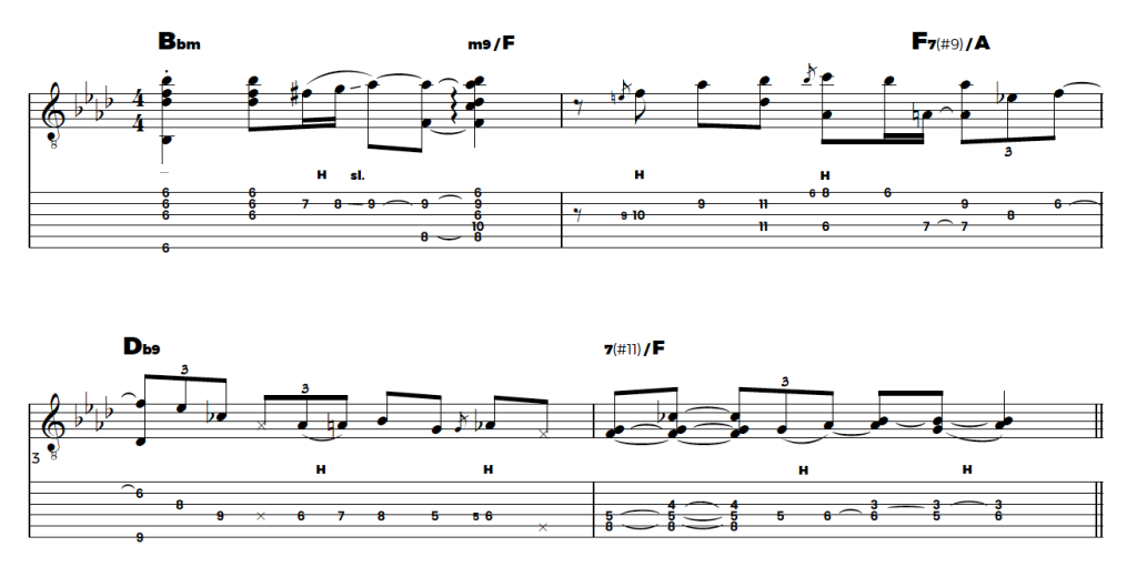 The borrowed ‘out of key’ note A [b9 in the key of Ab] in bar 2 is a good example. Besides adding harmonic information it also provides for a stronger resolution tendency towards the next harmony.